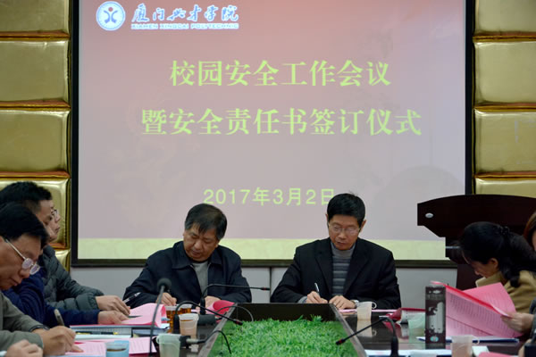 3月2日上午9:00,我校在中心会议室召开2017年安全工作会议暨安全责任书签订仪式。校党委书记何本伟、常务副校长施若谷、副校长刘文体及督学办张修业主任出席会议,各部门及二级学院负责人、党总支书记和各部门行政秘书参加。会议由刘文体副校长主持。