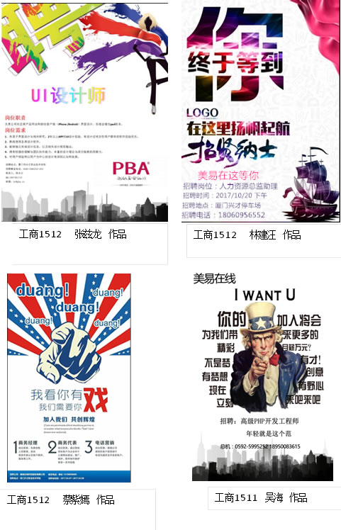 学生们纷纷到美易在线公司网站、厦门人才网等收集素材,“八仙过海,各显神通”,每人设计出一份生活活泼、醒目吸睛、美观的海报,经过师生投票,推选出一批优秀海报作品。