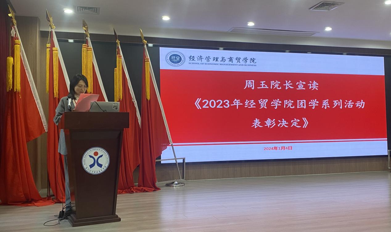 经济管理与商贸学院周玉院长宣读《2023年度经贸学院团学系列活动表彰决定》