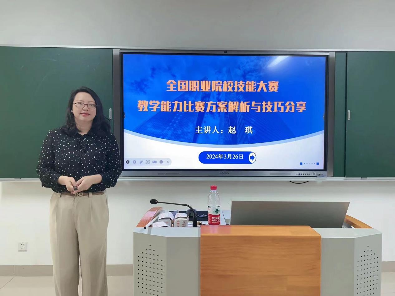 教务处副处长赵琪围绕专业教学能力和数字素养水平,对全国职业院校教学能力比赛方案进行了解析,通过透彻解读文件和生动的案例,让教师们对比赛有了更加清晰的认识。赵琪强调老师们需注重备赛过程中的实施计划安排与时间节点,建议教师根据教学实际融入科学精神和创新意识,深入挖掘课程中的思政元素,将思政教育与专业教学有机结合。