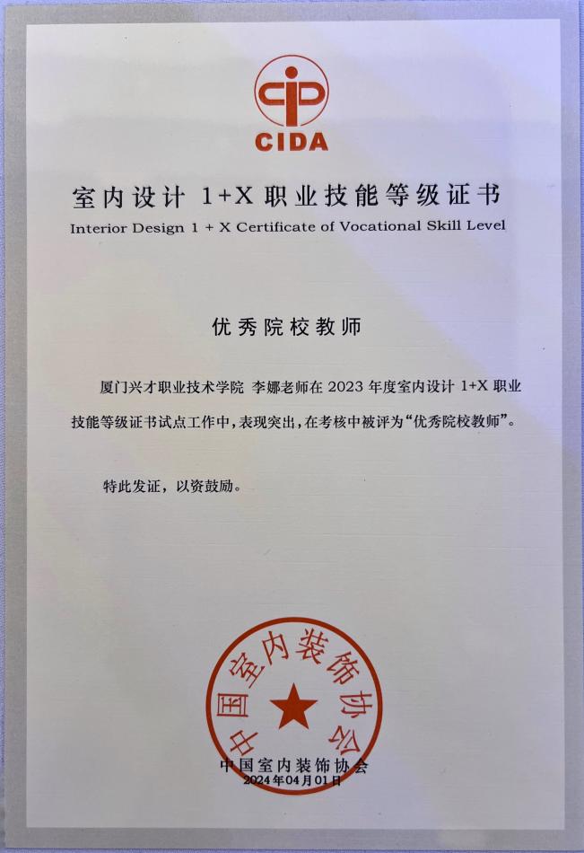 在刚刚结束的2023年度“1+X”室内设计职业技能等级证书试点工作中,我校艺术与建筑学院表现卓越,荣获中国室内装饰协会颁发的“优秀试点院校”称号。同时,李娜、毛佳伟两位教师被评为“优秀院校教师”。这是继2022年后,我校再次获此殊荣,充分体现了学校在室内设计教育领域对“1+X”职业技能等级证书考证工作的高度重视和取得的显著成果。