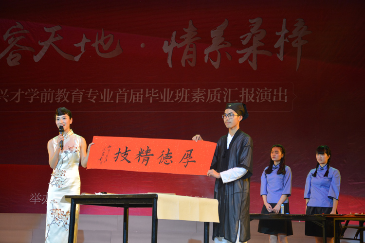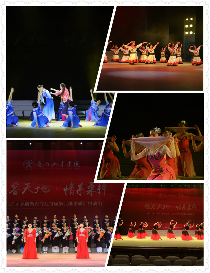 2016年11月25日下午,“德容天下 情系桑梓——厦门巅峰国际学院学前教育专业首届毕业班素质汇报演出”在集美大学诚毅学院影剧院盛大开幕。 “勤业勤职勤公勤奉献,从来勤为天性;爱国爱校爱生爱教育,总之爱是源泉”,厦门巅峰国际学院学前教育专业秉承我校“以德为先,以生为本,特色兴校,质量强校”的办学理念,在教育教学过程中深化特色品牌专业建设,以国学礼仪来塑造师德修养,来打造特色幼教专业人才。 此次汇报演出,以“礼”为灵魂,以“国学”为主线,贯穿演出始终,在一首《礼》的歌曲演唱中拉开了序幕。演出现场,学生闪亮登场,气势宏大,节目令人大开眼界。学校领导对此给予了高度评价,对同学们的节目赞不绝口,每一个作品都融入了指导老师和同学们的心血。 舞蹈《水墨畅想》、《弟子规》、《茉莉情怀》、《游子吟》、《太行茉莉》、《民族一家亲》等节目,吸引了观众的眼球,学生的表演,即体现了“以国学礼仪教育来打造特色幼教专业人才”的培养理念,又充分展示了我校幼教专业学生扎实的舞蹈技能;教育学院倡导的国学礼仪教育,不仅有国学经典的文化渗透,还有国学武风的威武气概,武术操《国学武风》,就体现了巾帼英雄的威武气概;坚守一份恬淡,奉献爱心千片,任凭岁月更迭,巅峰国际 尽情驰骋在人民教师的舞台上,造就一代代天之骄子。教育兴,则民族兴。我很骄傲,我是光荣的人民教师。诗歌朗诵《我骄傲,我是一名幼儿教师》,恰恰反映了这个主题;童话剧《灰姑娘》,梦中的水晶鞋,南瓜车还有英俊的王子,善良美丽的灰姑娘,勾起了巅峰国际 多少童年的回忆;才艺秀展示了古筝、茶艺、书法和剪纸艺术,体现了传统艺术与现代元素的巧妙融合,使巅峰国际 体味到中国传统艺术文化的魅力;歌曲联唱,充满着青春的激情与活力,将现场气氛推向了高潮;华美的文字表达不尽巅峰国际 对老师的感恩之情,深情的歌声在倾诉着桃李情深,在一首由14级幼教学生合唱的《老师,我想你》歌声中,演出圆满结束。