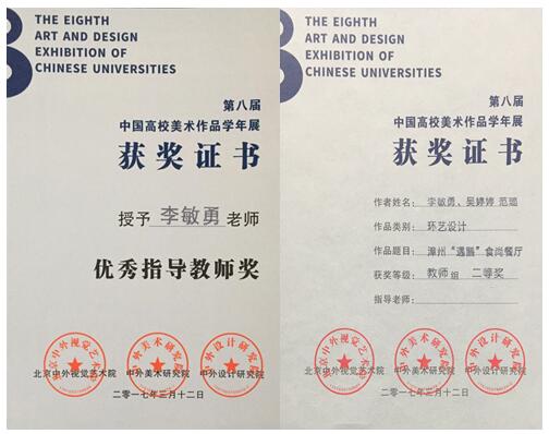 在刚刚结束的第八届中国高校美术作品学年展中,我校艺术与建筑学院学子共计荣获一个二等奖,一个三等奖及一个优秀奖的好成绩。 本届高校美术作品学年展共计收到来自全国千余所高校的有效稿件8962件,其中美术造型类作品3169件,美术设计类作品5793件。展览评选遵循“广泛掇英,宁缺毋滥”的原则,最终评出:美术造型类获奖作品193件,美术设计类获奖作品323件,获奖率约为6%。获奖作品充分代表了当前高校美术与设计创作的最高水准,堪称全国高等院校美术与设计界的国展、国赛。 据悉,我校建筑室内设计教研室自2016年推行工作室化教学以来,以职业技能培养为主导,以实际工作过程为指导,以就业需求岗位为标准,以虚拟和真实的项目为载体,培养学生的职业素质,专业知识,技术技能,采取“实战实练、项赛结合”的工作室化教学模式,营造真实的职场氛围,培养学生的岗位工作能力,落地项目得到业主及内业的多次认可。