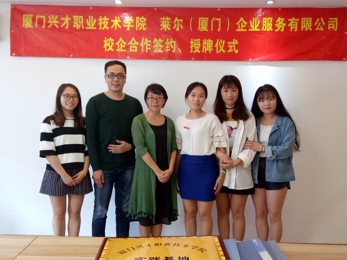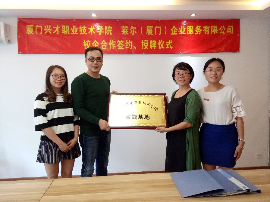 2017年4月17日下午,管理学院彭晓娟副院长、会计教研室专业带头人陈晓珊老师受邀前往莱尔(厦门)企业服务有限公司签署校企合作协议,并授予该公司“实践基地”牌匾。