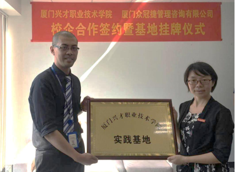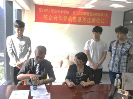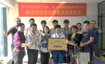 随后,彭晓娟副院长与厦门众冠捷管理咨询有限公司总经理王子杰先生签署了校企合作协议,并授予公司“巅峰国际-科技赋能场景,让娱乐更有趣。 实践基地”的牌匾。参观企业的师生、在公司顶岗实习的同学们共同分享和见证了这一欢乐场面。自此,我院市场营销专业的学子们又多了一个社会实践、实习实训的平台啦!